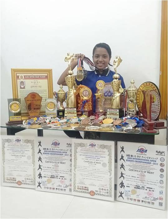Drithi R A of IX Standard bagged Gold and Silver Medals in below 14 Years Black Belt category in JSKA International Open Karate Championship 2018 held at Ananthapuram. Silver and Bronze Medal in below 14 Years Black Belt category, in National Level Karate Championship held at Nandini Sabha Bhavana, Mangalore, she won Gold Medal in below 30 Kg Black Belt category Taluk Level Karate Championship held at Red Camel, Neermarga. Silver Medal in below 14 Years Black Belt category, in 40 International open Karate Championship 2019-20 held at Anna Stadium Ooty, Tamilnadu. 1 Gold and 2 Bronze Medals in National Level open Karate Championship 2019-20 held at Loyola Composite PU College, Bengaluru.