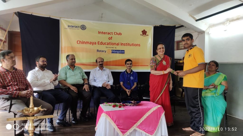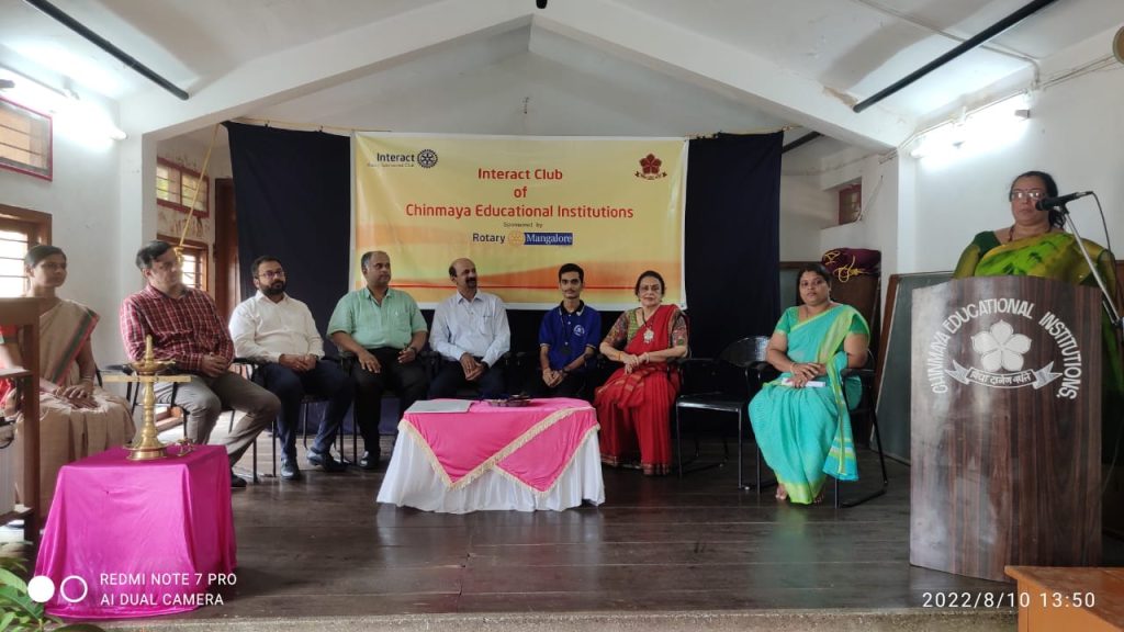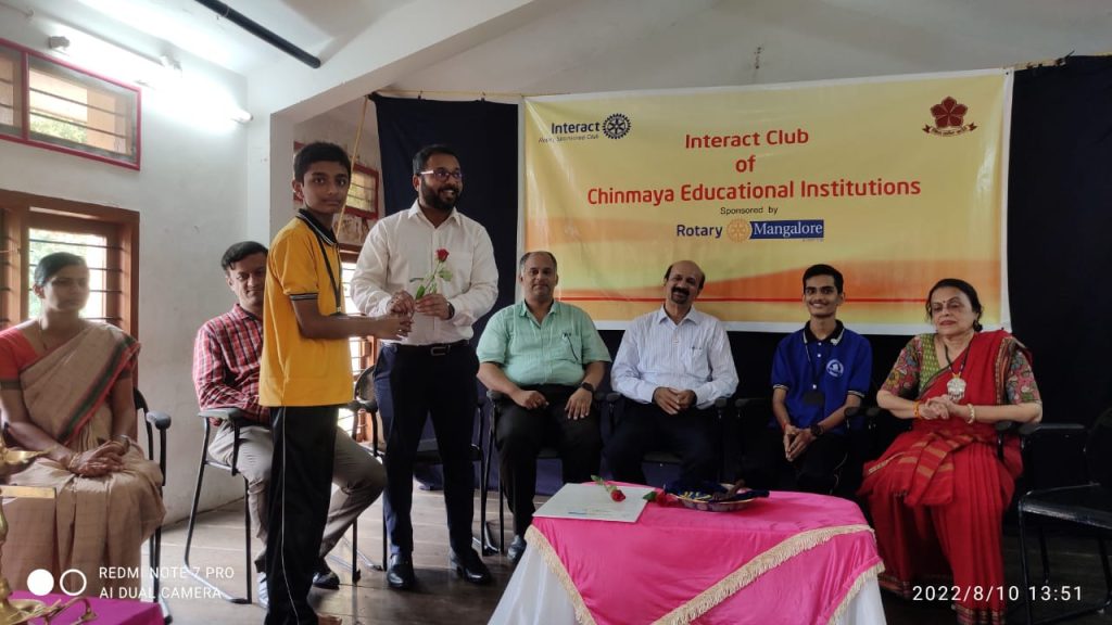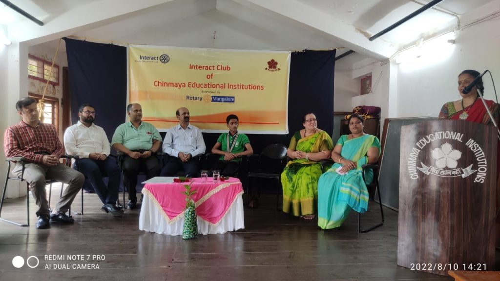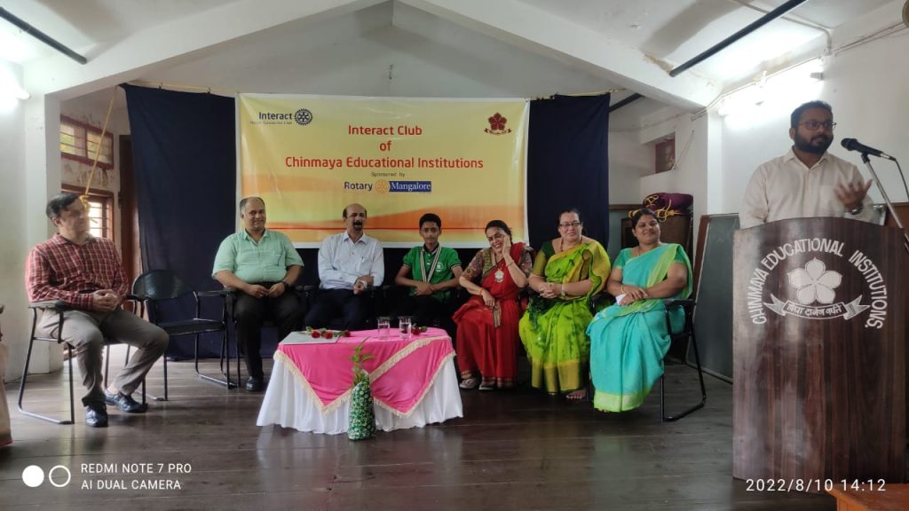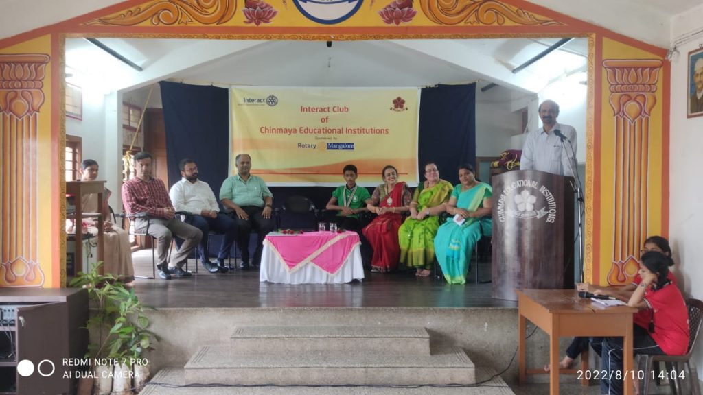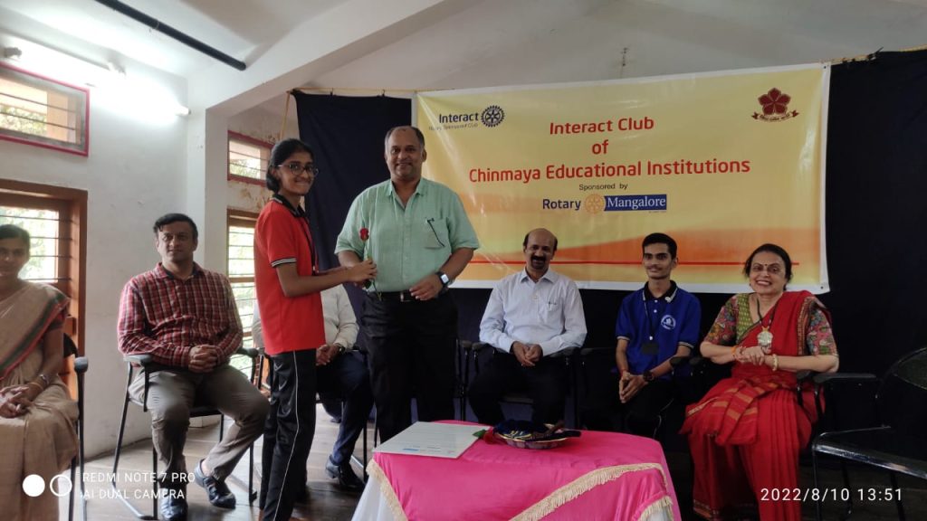The installation of Office Bearers of Chinmaya Educational Institutions was held on Wednesday 10th of August 2022 presided by Rtn. R.K.Bhat , President of Rotary Club Mangalore, Mrs.Bharathi Shevgoor, Secretary of Chinmaya Educational Institutions ,Rtn. Mayur Sherigar, Youth Service Director , Rtn. Ashwin Pai maroor, Club Secretary, Rtn. Vishal Mallya, Interact Chairman, Mrs. Purnima J.Bhat , staff coordinators Mrs.Ashalatha and Mrs.Vani Mukunda were present on this occasion..