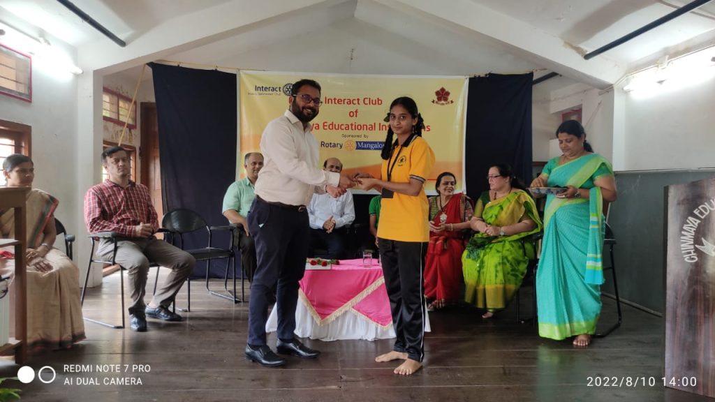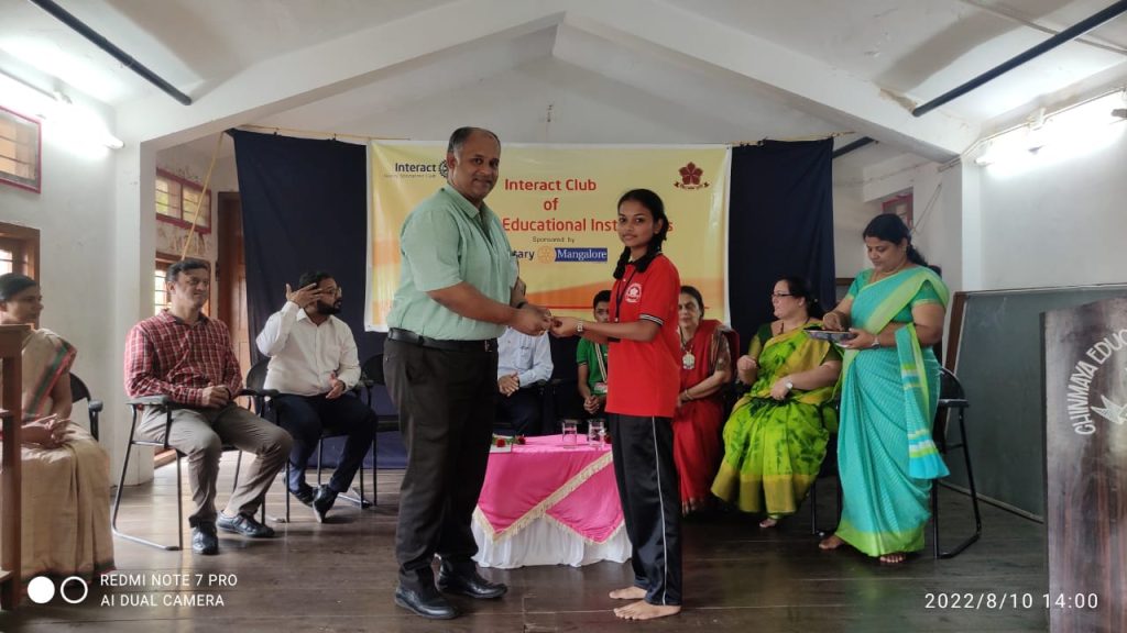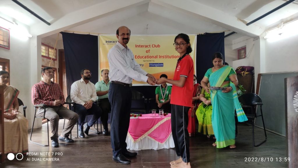 Rtn. R.K.Bhat, President of Rotary Club inducted the Interact President . Int. Anush Mohan. President Int. Anush Mohan gave his acceptance speech. Rtn. R.K.Bhat and Rtn.Mayur sherigar addressed the Interactors.