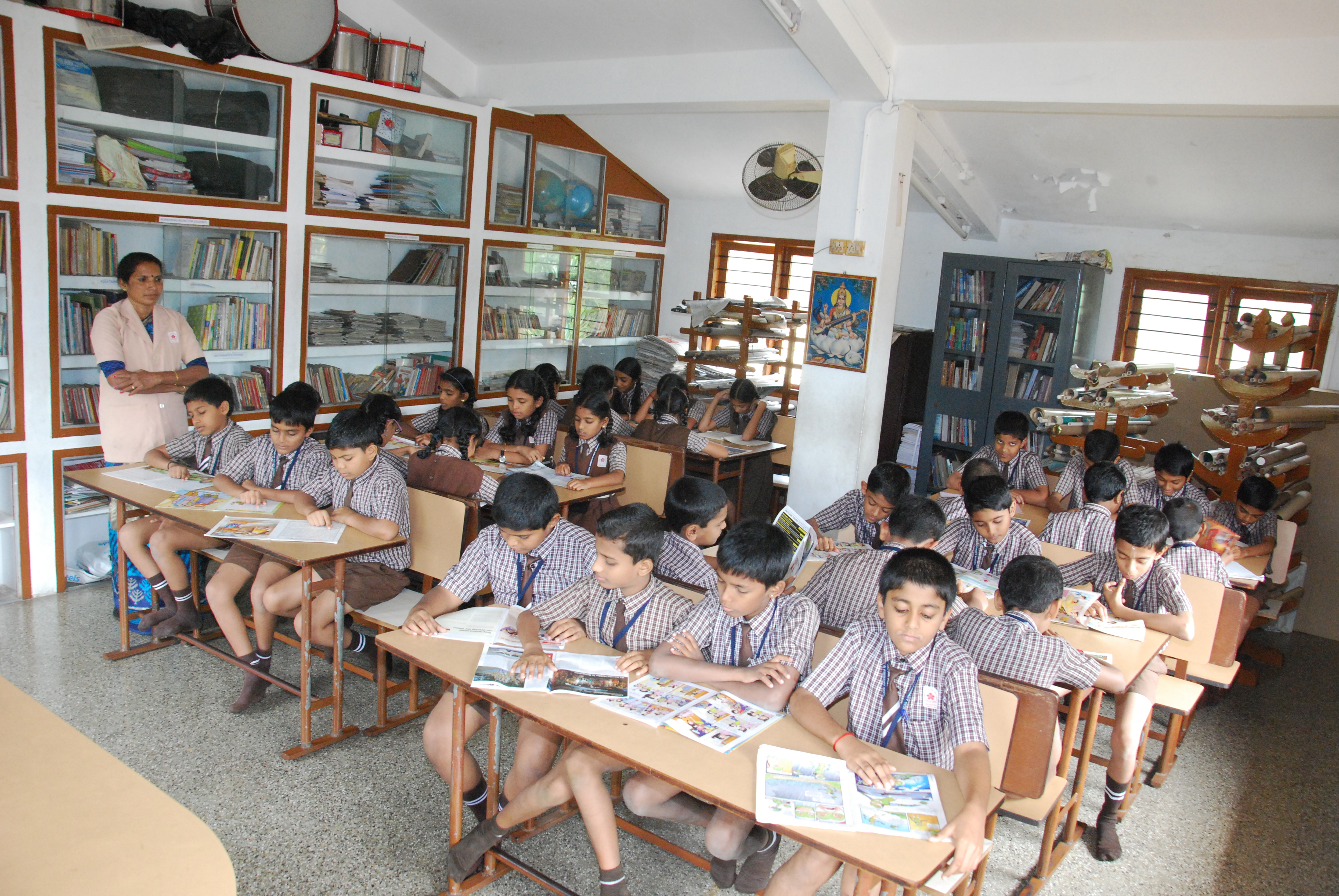 A Library is a Passport to Wonders and Miracles. It opens our Eyes and Heart to the World beyond our Front Doors. The Library at Chinmaya School is a Knowledge Resource Center where Students access Information through Books. Our Library is designed to provide Information and Knowledge to our Students. We have built our Collections carefully by including Good Quality Books. Regular reading is encouraged in our Curriculum. Our Library consists 3700 books out of which more than 1000 are Reference Books and 25 are Periodical. Our Library includes some Reference Books such as Encyclopedia, Britannica, Limca Book of record, year books, the epics like Ramayana, Mahabharatha and Bhaghavadhgeetha, Biography Books, Experiment Books, Quiz Books, etc.